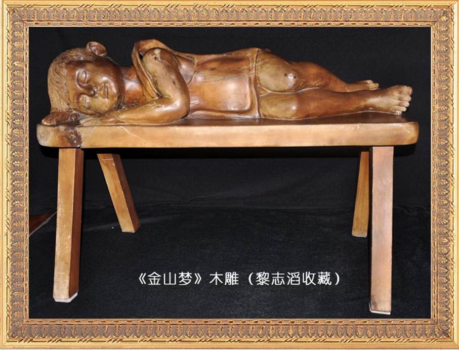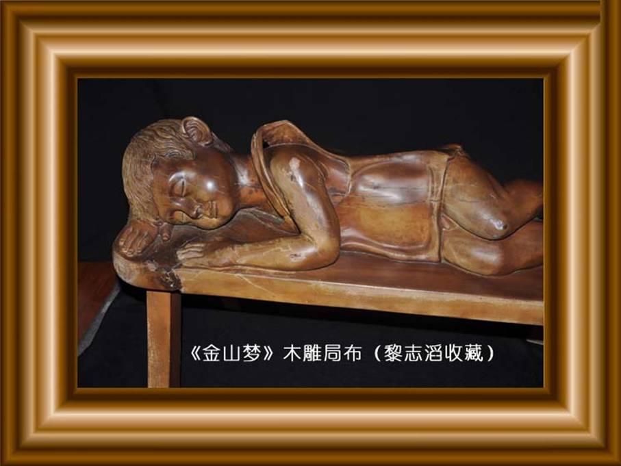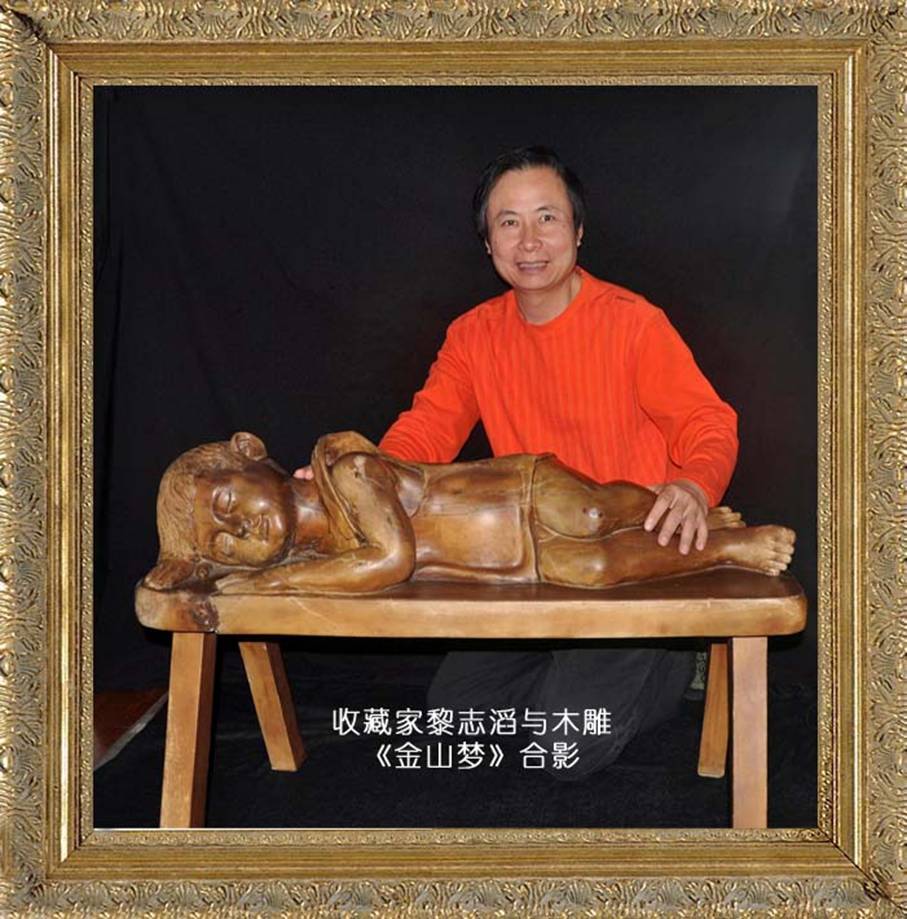 最近,收藏家黎志滔在美国旧金山发现一件珍贵木雕艺术品《金山梦》,许多人看了之后评价很高,极具欣赏价值,是一件难得的华侨历史文物。这件木雕艺术品与真人一样大,用优质木料雕刻而成,长95cm,高83cm。由于没有落款,作者及创作年代不详。从皮壳包浆上看,历经岁月苍桑,整体效果基本保护完好,经多位专家初步鉴定,已超过100年历史。作品是塑造一位三、四岁大的中国小男孩,静静地淌在中国式的八仙凳上甜甜地睡觉,父母外出去了做工,孩子在家玩后休息,在做梦,梦见能在旧全山度过好日子,梦见父母能给下一代幸福生活。这是一般人在孩童时代都有经历过的生活细节,小孩造形有童趣感,非常精明可爱,又具备人性化一面,从艺术内涵、思想品味都是很好的艺术品。