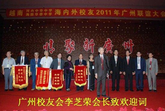 各位校友,大家都知道,我们越南河內中华中学和海防华侨中学有着大半个世纪的光辉历史,培养了一批又一批的精英人才,但是大家知道,从上世纪七十年代末,一场暴风雨使到我们校友漂泊到世界各地. 三十多年来大家艰苦奋斗重建家业,最后事业有成,为当地社会作出了不可磨灭的贡献. 与此同时,各地的校友都纷纷成立了很多个大大小小的校友会.在这里(台上)都是各地来的校友会会长的一部分;同时还举办了多次的世界性旳,地区性的联谊聚会.在这里特别值得一提的是2009年的南宁联谊懇亲大会;全世界各地的校友热心解囊筹集了近百万元的善款,有力地支持了当地的文教事业和贫困侨生. 我们认为这是我们校友联谊活动的创举;我们对此表示深深的敬意! 我们广州校友会于1989年成立至今已是26个年头,26年来广州校友会在广州市侨联的领导和关怀下,我们互助团结,发扬爱国爱乡精神,参加祖国社会主义建设都作出了很大的贡献.至今,我们广州的校友的生活亦起了翻天覆地的变化!
