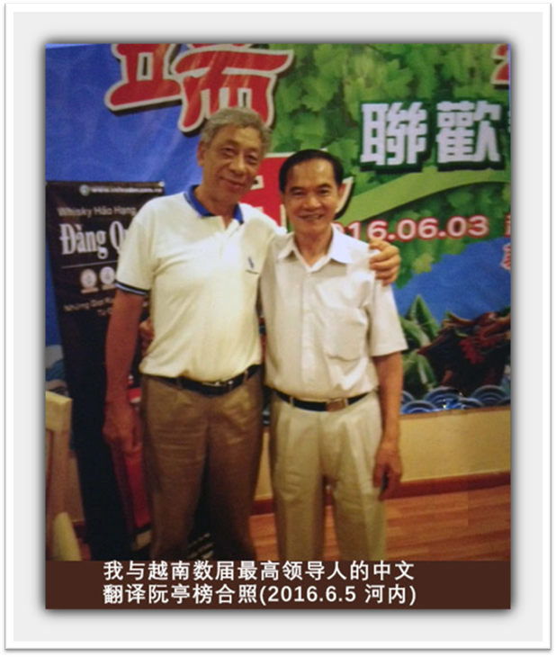 我与胡乾文最近的一次见面是在海南省海口市,他比我大一岁,当时我参加越南总理阮晋勇率领的越南经贸代表团访问中国,他以大使的身份全程陪同,至今已经七年多了。后来他又調到孟加拉国和柬埔寨任大使。现在还兼任习近平主席的东南亚问题顾问。阮亭榜比我俩大,他是越南多届领导的中文翻译,曾任职越南外交部中国司副司长和越南驻香港总领事,虽然年逾八旬,但保养得很好,看上去比我和乾文还年轻。