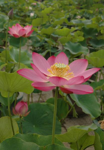 荷花池中水波潋滟,碧绿青翠的荷叶随风摇曳,盛开的荷花娇艳欲滴,含苞的荷花娇羞动人。摄影爱好者和游客们,端着不同档次的各种相机,有些拿着手机,在花间穿梭,都想把荷花独特的风姿带回家,永远珍藏。