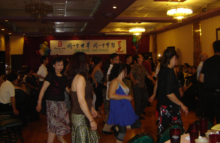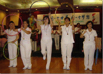 文艺演出由名誉会长梁光强主持,“歌唱祖国”由坚挺的、实力雄厚的晚会压轴明星合唱队率先唱起来,穿着印有红色“京”字印、“Beijing 2008”白上衣和白长裤的女校友,手持彩环在雄壮、响亮的歌声中,以健美的舞姿、变幻的队形在舞池翩翩起舞,顿时激发全场校友的爱国激情,年过六旬的老校友、正值立业佳期的壮年侨友,还有他们年轻的儿女和年幼的孙子们,都禁不住心中的激情,或合着拍子击掌、或跟着唱了起来,那银发下含着闪烁泪花的眼睛,那汇聚着烫热泪水、历尽沧桑的脸上尽显了这些老侨中、老中华校友怀里的激情。这是多么亲切、感人,熟悉、令人振奋、叫人自豪,虽历数十年,仍没法忘却的歌曲啊!这首歌,让我们认识了自我、给予我们在艰难、颠沛的人生长路中获得力量和勇气,去迎向困难、战胜艰险、开创美好的明天!这首歌标志着经历太多苦难、太多艰辛的中国人民,走出了屈辱的历史,以无所畏惧、坚韧不拔的精神营建自己的共和国,用改革开放30年积累的强大的国力与非凡的力量,将昔日的梦想变成今天的现实!“离国倍爱国,出国更亲国”——这也许是海外华人深刻的感悟和深藏心底里的情怀。
